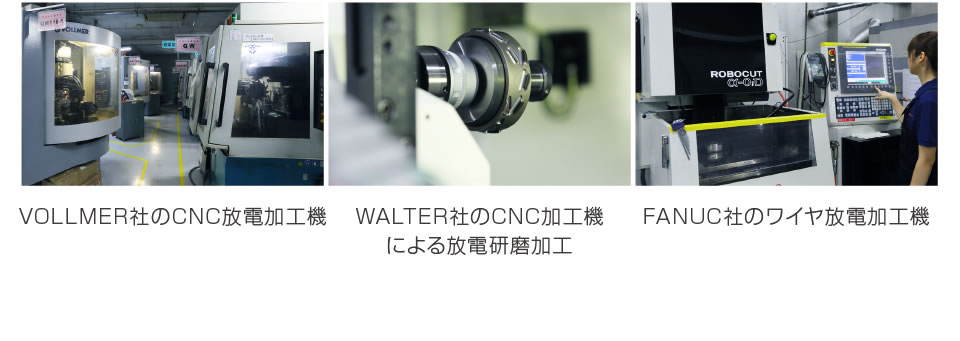 充実した最新の設備と手加工で培った職人技の融合、それが当社の技術力です。どんな複雑なオーダーメイド刃物にも対応できるよう、ドイツVOLLMER社・ドイツWALTER社・オーストラリアANCA社等、各社の放電加工機・ワイヤ加工機・NC研削盤をはじめとする、最新鋭のテクノロジーを搭載したNC加工機を計30台以上導入しており、あらゆるご要望にお応えした刃物の加工が可能です。